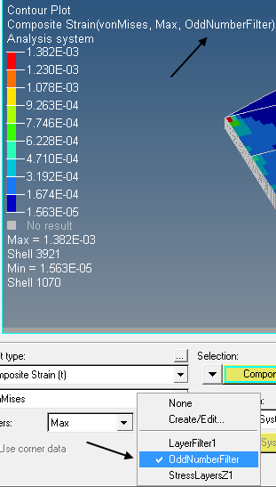 The layer filter reduces the layer list available in the Contour, Iso, Vector, and Tensor panels for the data types that have layers (for example, plies in composite stress/stains or any tensor result with layers).