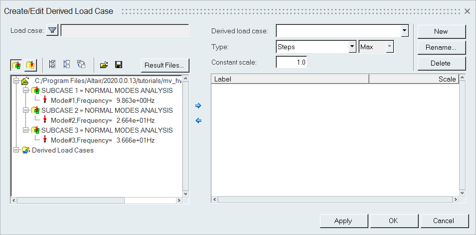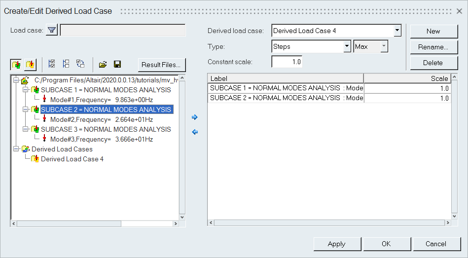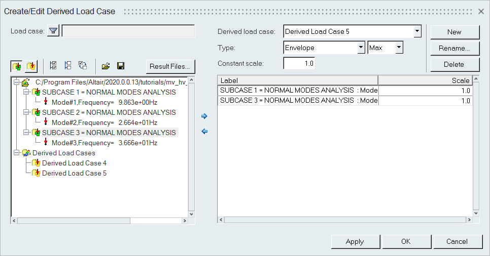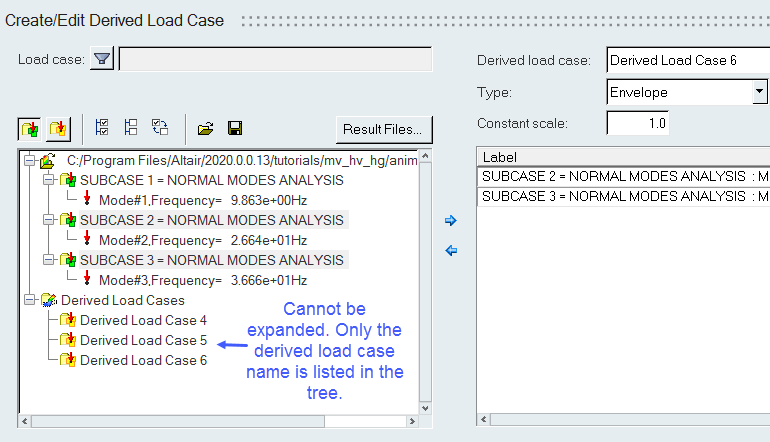 If loadcases from multiple result files are referenced, it is recommended that you include all the required result files prior to creating any derived loadcases. See the Update Result Files topic for additional information regarding adding result files.