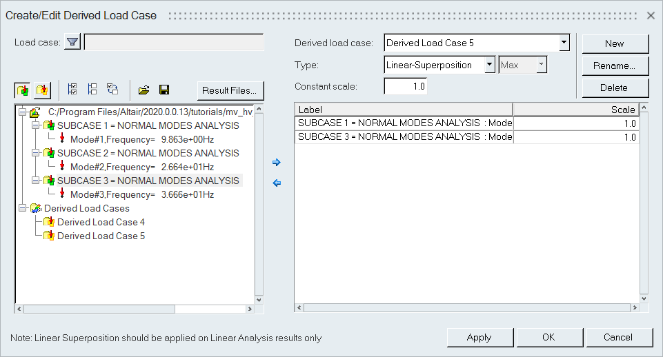 The Linear Superposition type is used to create a derived loadstep with only one simulation step, which is a combination of all the selected loadsteps/simulations with scale factors.