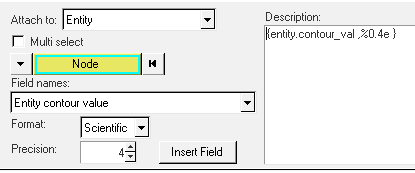 Note: Format and precision for this field can be modified. If you would like to change the format and precision, set it before inserting the field in the note box. In the case of a MaxLayer, MinLayer, ExtremeLayer or Top/Bottom contour plot the evaluated expression returns a string and not a numeric value. In this case, format and precision are not available. - {entity.contour_max}