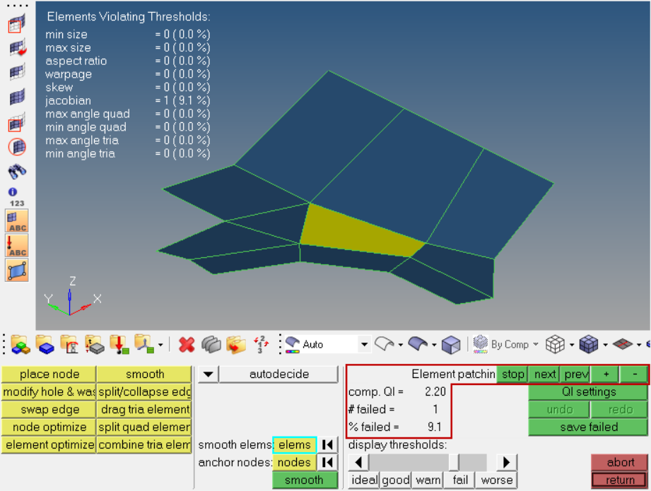 The Patch Checker displays the comp. QI value, the number of failed elements, and the percent of failed elements in each patch. To reduce the number of failed elements, use the Quality Index cleanup tools. Once you have corrected all of the elements in the patch, you can move on to the next patch. You will no longer be able to display the previous patch, as all elements are corrected.
