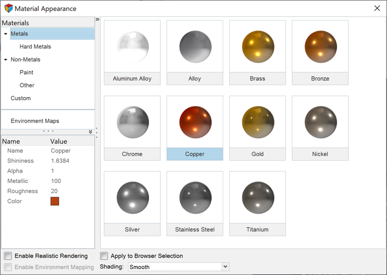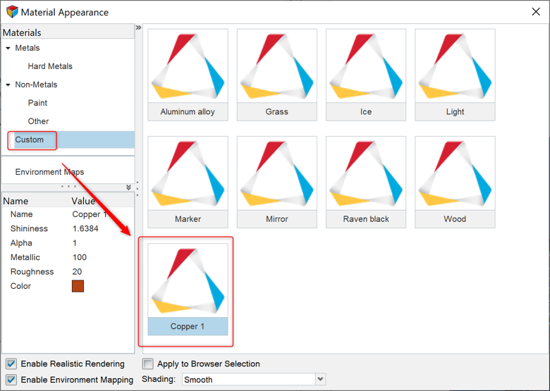 material, Copper 1 will now appear under Custom with the base values of the Copper