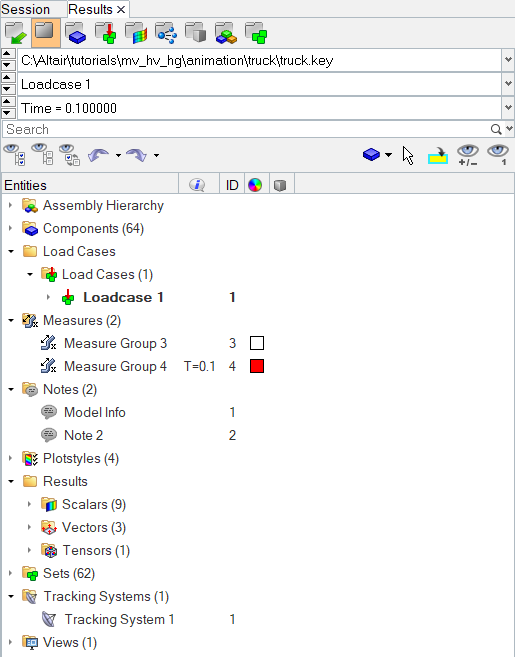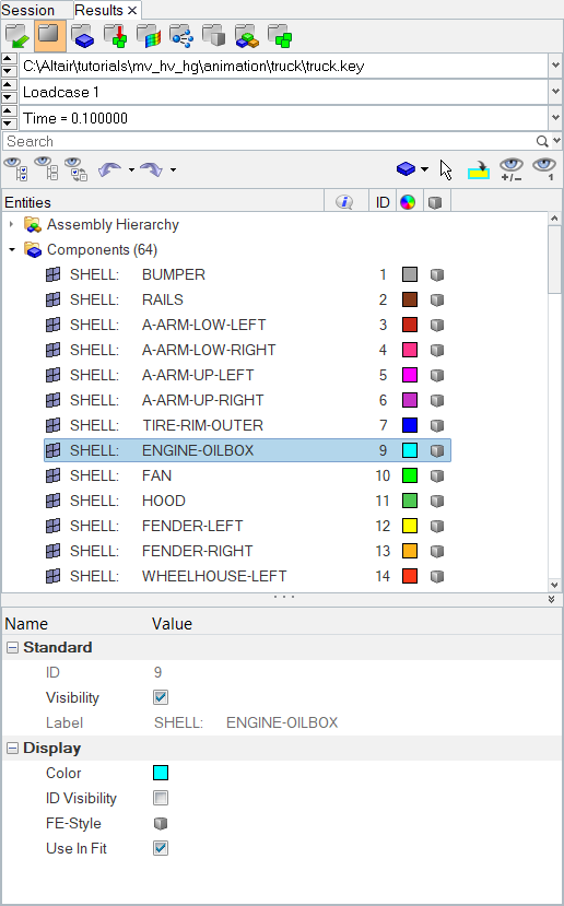 The Results Browser resides on a tab in a tab area sidebar and allows you to view the HyperView model structure while providing find, display, and editing control of entities.