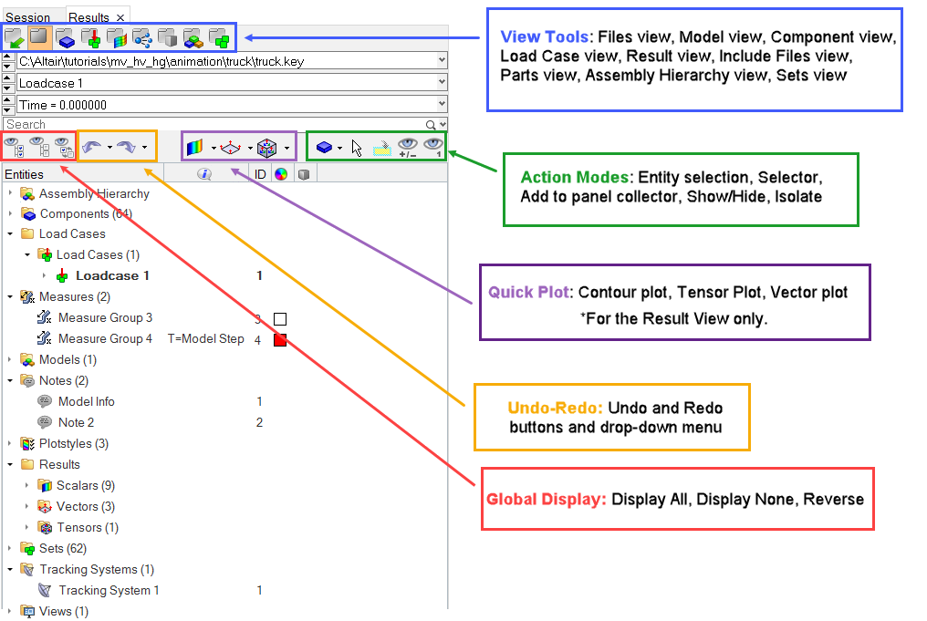 Many of the Results Browser functions are accessed via the View, Global Display, Quick Plot, and Action Modes groups of buttons. In the image below; the blue call-out is the View Tools, green is the Action Modes, purple is the Quick Plot, and red is the Global Display.