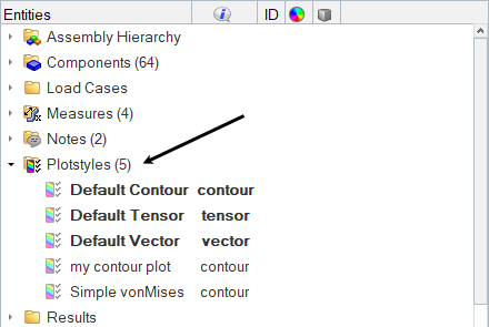 A plot style is a collection of predefined settings for a contour, vector, or tensor result plot type. The default plot styles provided by HyperView are displayed in the Plot Styles folder: