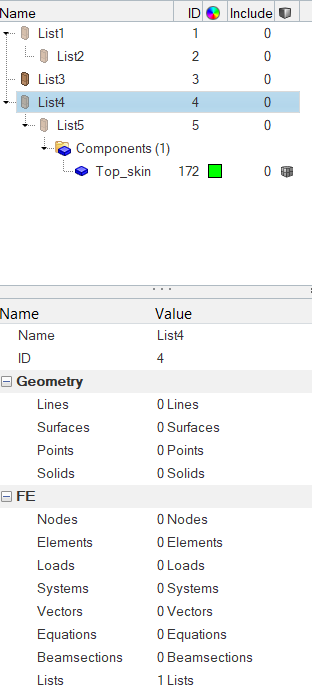 Use the List Browser to group elements, components, parts, loads, sets and systems into a single list entity regardless of the parts/subsystem/CAD BOM organization maintained in the Model/Part/Subsystem browsers. You can select or drag-drop entities in the List Browser and export the list to a solver deck. This export gathers all of the related information, such as materials, properties, laminates and beam section data referred to by elements, components and parts, to the analysis decks.