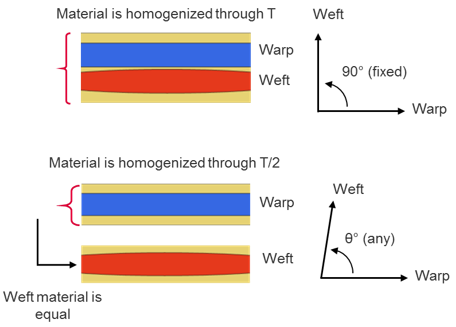 | Homogenization of matrix and tows in just one direction | Weave modeled as two uni plies with ½ T. Same material when θ changes. HyperMesh uses this methodology when importing woven plies from external composite data. |