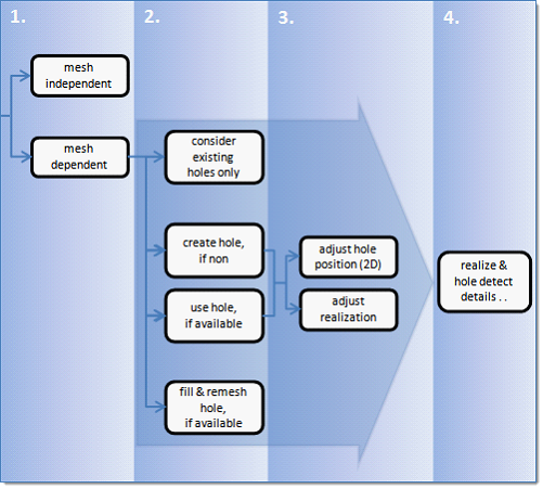 For 2D holes, one or two washer layers can be created, after which the surrounding mesh gets remeshed.