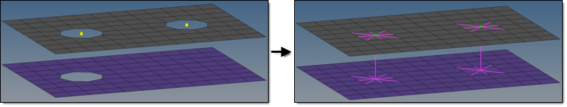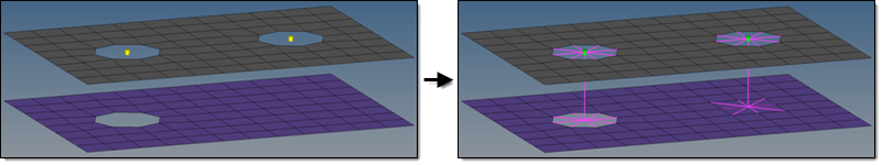 In the past, a fastener realization always required a hole for each layer in the initial mesh. This is no longer necessary for 2D meshes because the imprint capability punches the needed holes into the mesh before the final realization is performed, enabling the mesh to be manipulated in a pre-step. This makes it possible to punch holes, move holes, close holes, create washers, and so on.