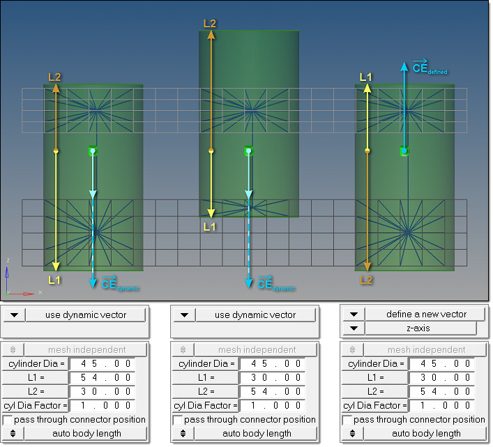 Figure 2. . Dynamic vectors have been used in the first two cylinder. Interchanging the values for L1 and L2 leads to very different realizations. By comparison, the third cylinder uses the same values for L1 and L2 as in the second cylinder, but the result looks better because of the predefined connector vector in the global z-direction. - In some automated processes, the cylinder diameter is automatically set