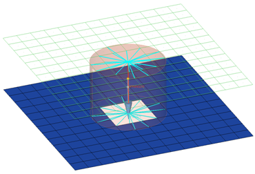 This realization creates a SPRING element for the body, and projects and connects the element to nodes of the adjoining shell/solid elements with RBE2 elements within the prescribed cylinder diameter, L1 (cylinder height along the vector from the connector location) and L2 (cylinder height in the opposite direction of the vector from the connector location).
