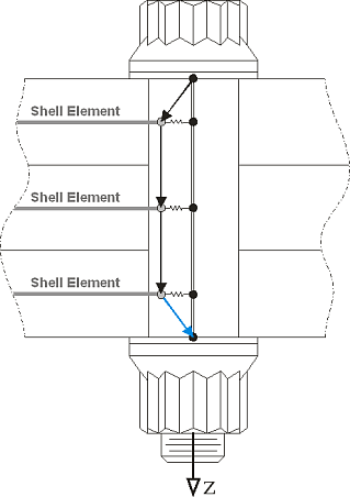 The outer extensions represent the thicknesses of the outer shell elements. The inner nodes of the RBAR element are connected to the shell elements whereas the inner nodes of the CBAR elements are coincident to the shell nodes. Between the appropriate connected and coincident nodes CBUSH elements are created. Each outer node connects one CBAR and one RBAR.