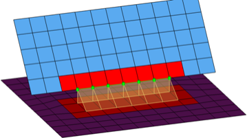 Creates two quad rows-the first one perpendicular to the opposite shell link, and the second one with a certain angle to the first one. In addition, a certain pure quad element pattern is created around the seam elements, shown here in red. These elements normally get imprinted into the shell links. The exact geometry of the seam can be influenced by the angle value.