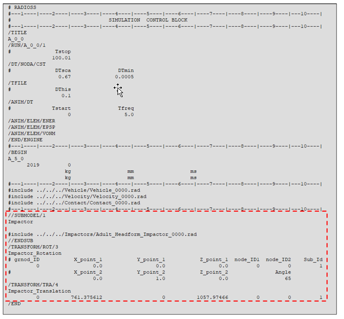 - The impactor include file is defined in a //SUBMODEL and the /TRANSFORM cards are automatically generated with reference to the impactor sub model.
