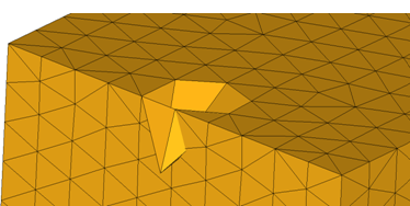 Figure 3. Needle Pocket. The involved elements form a sharp pocket pointing outwards of the volume.Per vol check Find the intersections that are only within the shell volumes. Intersections across volumes and open shells will not be found. If this checkbox is disabled, intersections will be checked for all of the input elements/components even if the input shells do not form closed volume. Along with intersecting and diehedral elements, all duplicate elements and close proximity elements within the user defined tolerance will also be found. All of the failed elements will be placed into a separate component for review.- ^err_x_elems