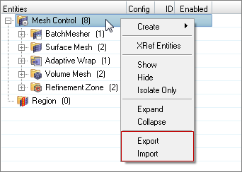 All defined mesh controls are exported to a single .xml file, which can be utilized as a template. The mesh control parameters are saved to the file, while any entity selection is not.