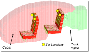 Acoustic cavity meshing takes seating into account, and generates a separate volume mesh for each seat (bench seats are correctly treated as a single assembly, not broken up into individual seats based on the number of humans who could sit on them). This distinguishes the seats from the mesh that represents the air space.