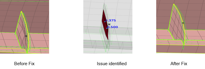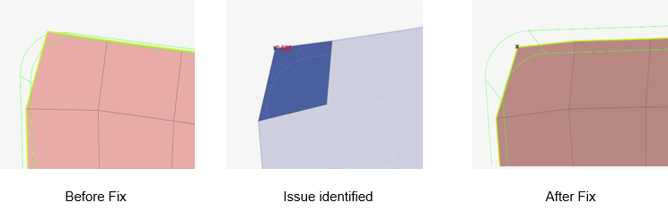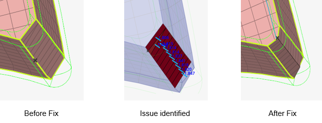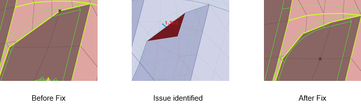 Use the Midmesh: Inspect tool to view/fix nodes deviating from the middle of the geometry, such as Nodes off middle, Nodes off solid edges, Nodes out of solid, Edges off solid edges, and Element centers off middle. The fix corrects the mesh to the mid by node movement or splitting elements.