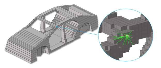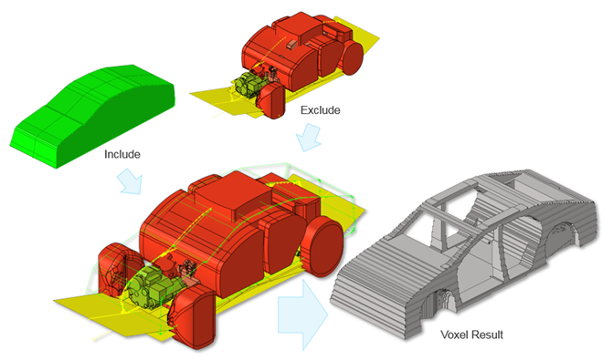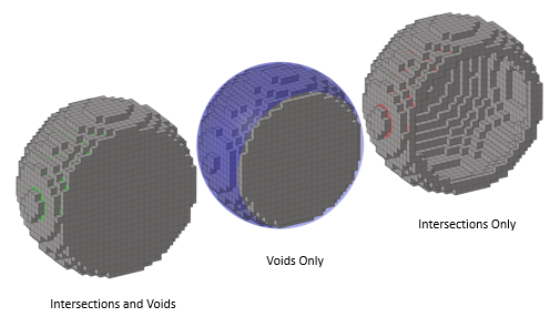 Voxels are generated at both the intersection of the part(s) and fills the voids of
