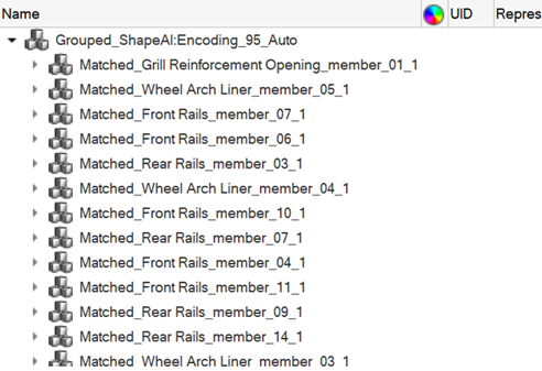 A progress bar initializes in the status bar. A part set is created for each group of parts that match each other. The top level part set is created using a combination of comparison method and criteria, and is prefixed with "Grouped_." Nested part sets are created for each part having similar or matching parts, with a prefix of "Matched_."