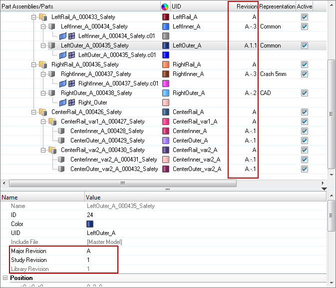 Figure 1. Revisions for the LeftOuter_A_000435_Safety.c01 Part. Major Revision = A (mapped to the PDM revision, user editable), Study Revision = 1 (can be any letter or numerical value, user editable), Library Part Revision = 1 (library version, not editable)