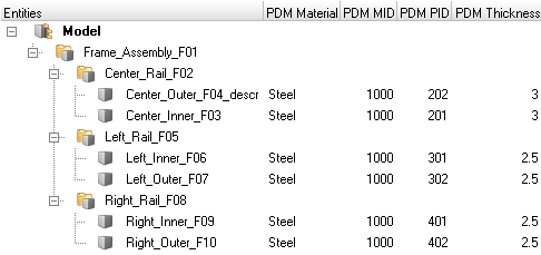 HyperMesh entities are generated from the PDM metadata, if available, in the post-run procedure of the BatchMesh operation. The PDM PID is assigned to the component and property, the PDM MID and PDM material is assigned to the material and the PDM Thickness is assigned to the Thickness attribute of the property. If the PDM Thickness is blank, the CAD Thickness calculated during the midsurface operation is automatically assigned to the Thickness attribute of the property.
