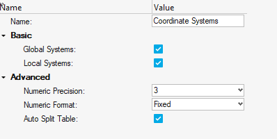 Once executed, a table output for Global Coordinate System is generated: