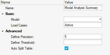 Right-click at the Report or Chapter level and select .Restriction: This module is available for HyperView only.- Below are the properties associated with Modal Analysis Summary module: