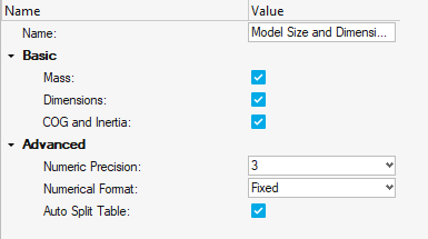 Creates three table outputs including - overall model dimension, centre of gravity and inertia of the model and model mass.
