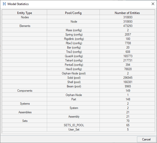 Add model statistics to the report in a tabulated form, such as the various entities present in the model and the number of entities belonging to each entity type.