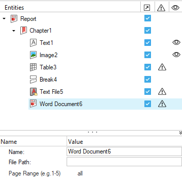 - By default, the Page Range value is all. All pages from the external Word document are added to the report.