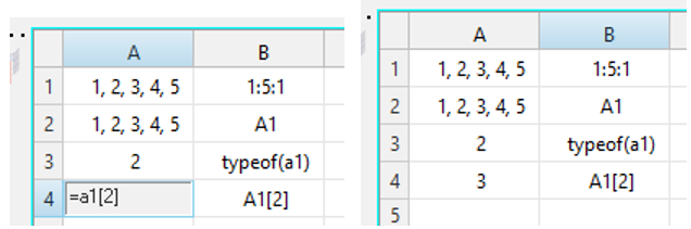 • The expression "=A1[2]" in cell A4 returns "3", the third element of cell A1.