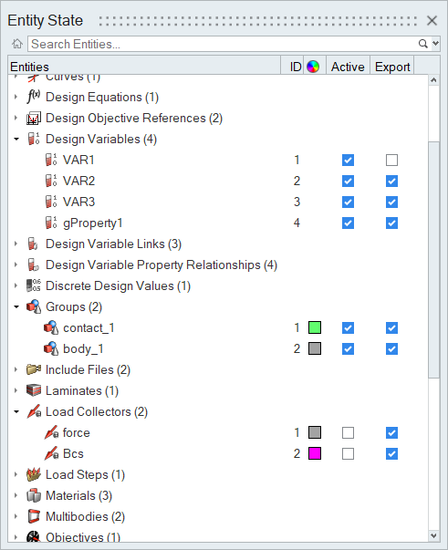All entities in the current model that have active and export states are shown in the browser at all times.