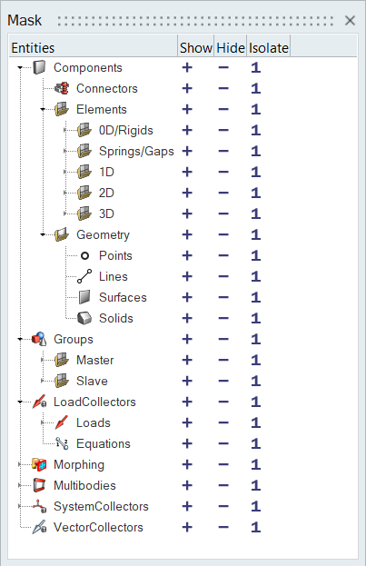 The entities are logically organized in the browser to represent the collectors they belong to. Regardless of the current model, the entities listed in the browser remain the same. The Show/Hide/Isolate columns contain icons that can be clicked to perform the relevant masking operations. The buttons perform the masking operations at the selected entity and folder level, and for all entities and sub-folders that may be contained within that folder. These operations are only valid for entities contained in collectors that are currently displayed.
