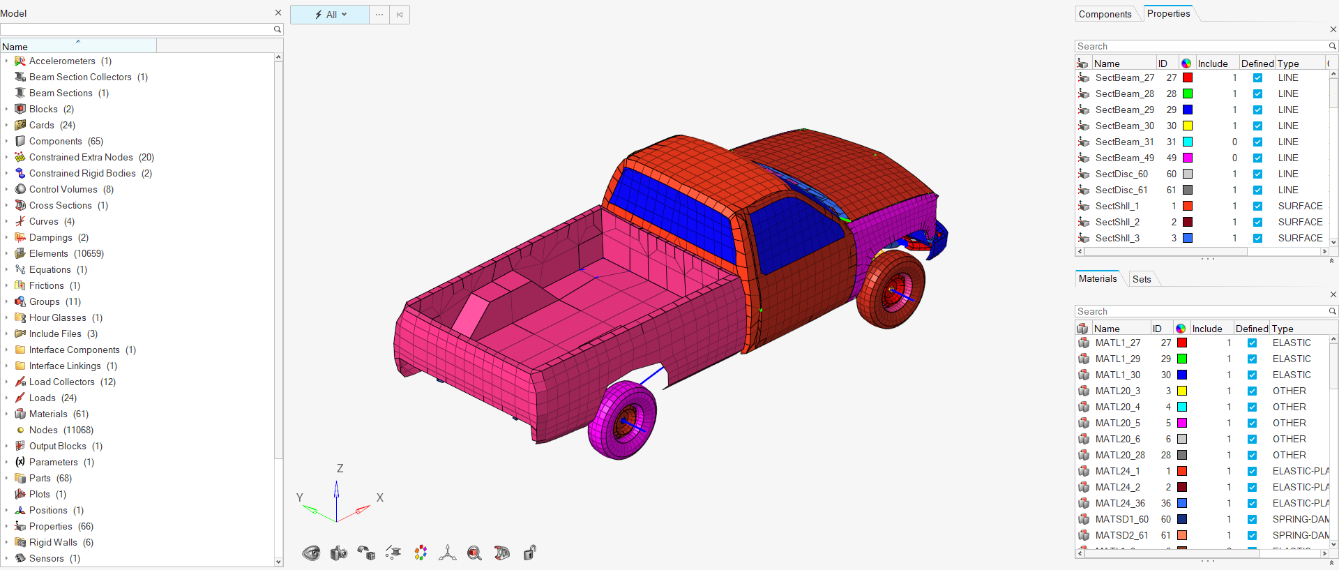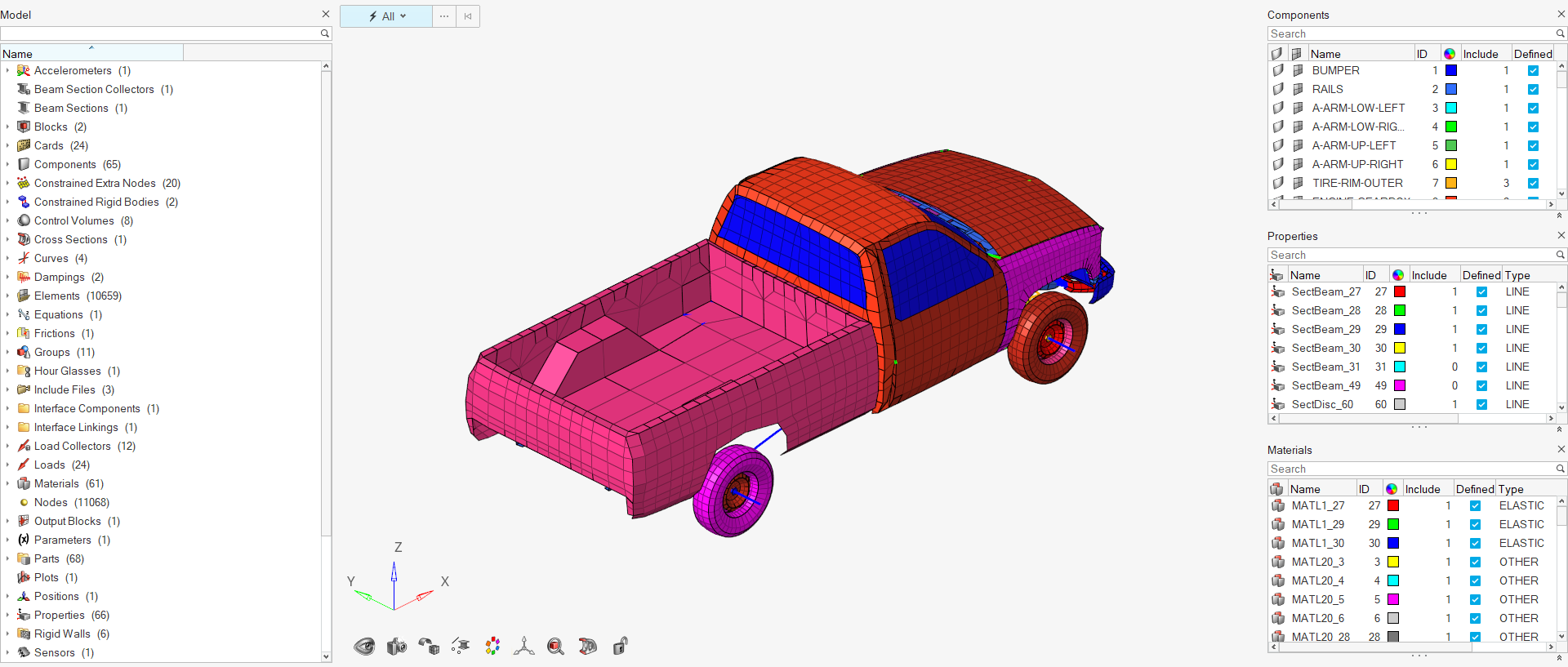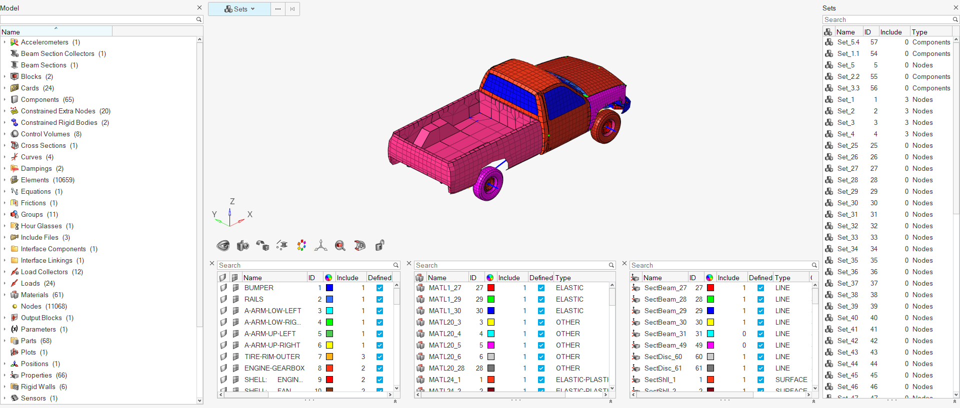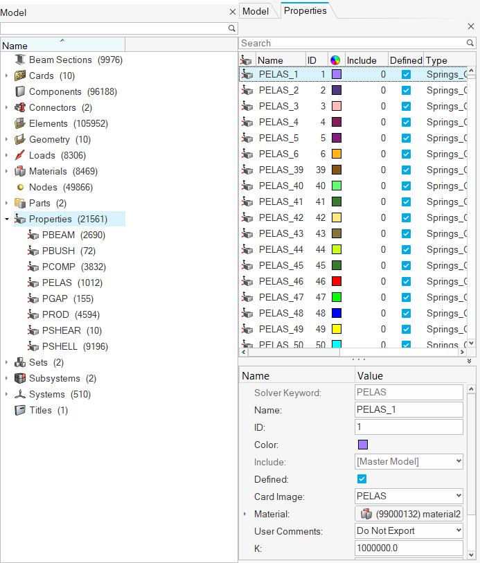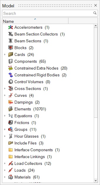 The Model Browser shows all the contents of a model present in the session. Entities such as nodes, elements, connectors, geometry, loads, and subsystems are now displayed, along with other entities such as components, properties, materials, and so on.