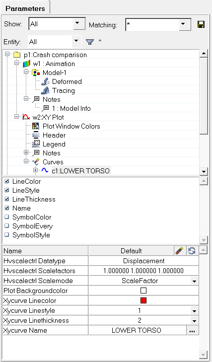 The Parameters Browser displays all windows and pages in the current session, including the attributes assigned to each entity. Under each entity is a list of the entity's attributes. Activating the checkbox next to any attribute includes the attribute as a parameter in the parameter table (located in the lower half of the browser), which is defined or kept in its default state when the process is re-run. To display the browser, click View > Parameter Browser in any client beside HyperMesh.