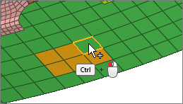 - Select entities that are located on the same surface face as the previously selected entity. HyperWorks finds entities that are attached to each other without crossing a feature line. Attached, adjacent surfaces, nodes, or elements are progressively selected when the angle between them is less than or equal to the specified feature angle.