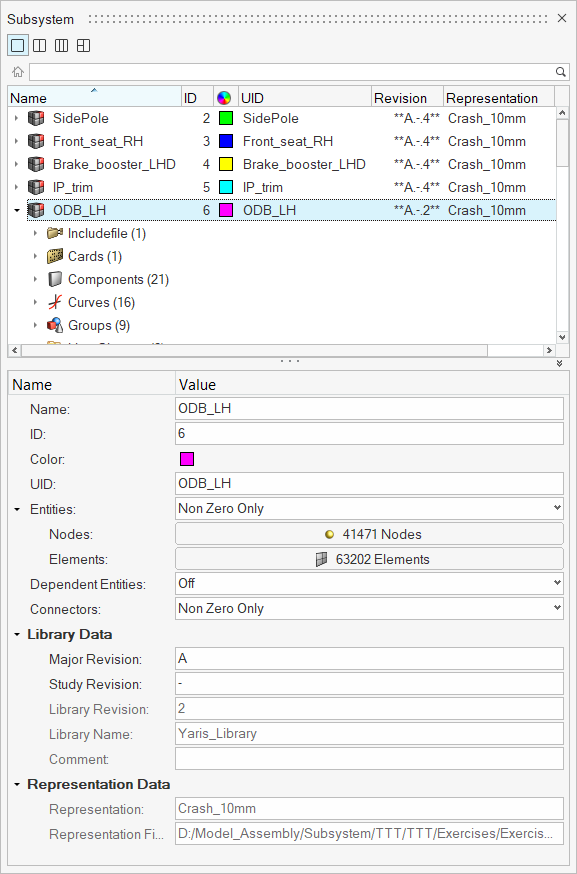 subsystems in the model along with attributes such as representations and revisions,