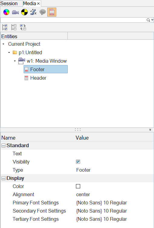 Displays the properties for the header and footer in the Media window. Click the