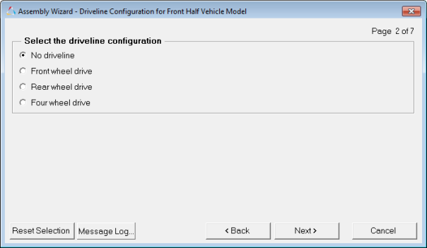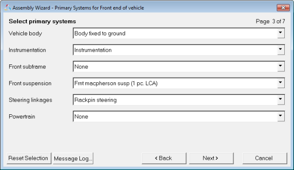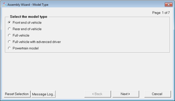 In MotionView, models are assembled from libraries of pre-defined systems using the Assembly Wizard, located on the Model menu. The Assembly Wizard dialog guides you through the assembly process, ensuring that your selections are compatible.