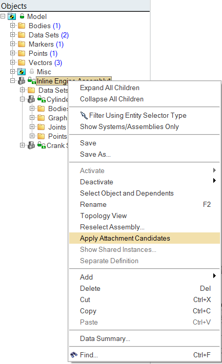 Shown below is the Cylinder 1 assembly which seeks a crank pin attachment point. This attachment (variable p_cp_att) has a “CrankPin” attachment tag. The crank pin point in the crank shaft assembly has a attachment candidate tag that has the value “CrankPin”.