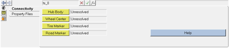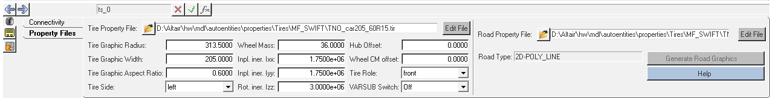 Hub Offset Defines the offset of Hub graphic center from the wheel center. Wheel CM offset Defines the wheel part CM offset from the wheel center. Tire Role Defines tire function: front or rear. VARSUB Switch Activates the solver variables that contains the tire’s states. This option can be used for control prototyping. - Road Property File