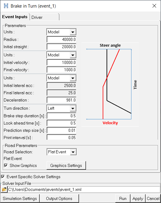Acceleration unit selection (Model, m/s2, g’s).Radius The radius of the circle that the vehicle CG will follow during the constant radius portion of the event. Initial straight Length of the initial straight section. Initial velocity Initial vehicle velocity. Final velocity Final velocity desired in the simulation. Turn direction Direction the vehicle turns during the event (as seen by the driver). Initial lateral acceleration Estimated initial lateral acceleration, calculated using the initial speed and the turn radius. Final lateral acceleration Estimated final lateral acceleration, calculated using the final speed and the turn radius. Deceleration Desired deceleration of the vehicle after achieving steady state. Turn direction Direction the vehicle turns during the event (as seen by the driver). Brake step duration Step duration of the desired deceleration. Look ahead time Look ahead time, used by the Driver Feedforward steering model. Prediction step size Maximum step size, used by the Driver Feedforward steering model. Print interval Time interval of data output to the plot file (.plt) and graphics file (.h3d). - Road Parameters