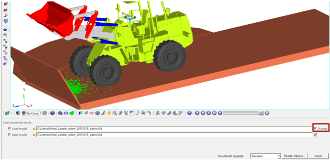 - Overlay the EDEM H3D in HyperView using the Overlay option in the Load Model and Results panel to visualize the entire system in one environment.