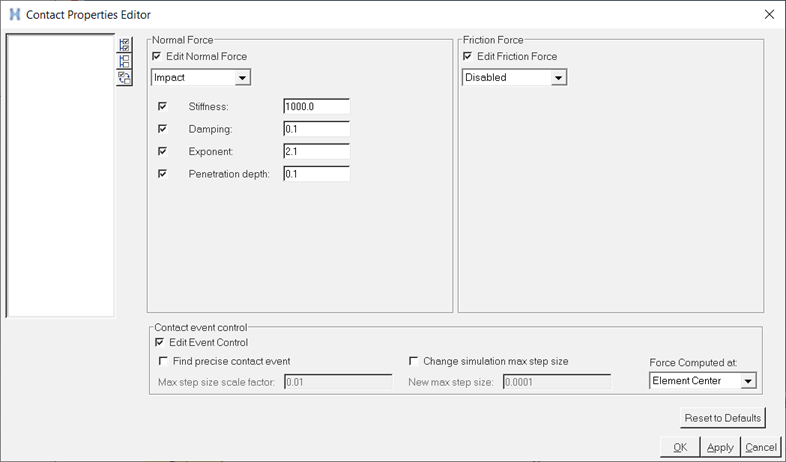 - Activate the check box to edit the Normal Force options of the selected contacts. This option is checked on by default. Activating this check box activates further options to change the normal force method and its properties.