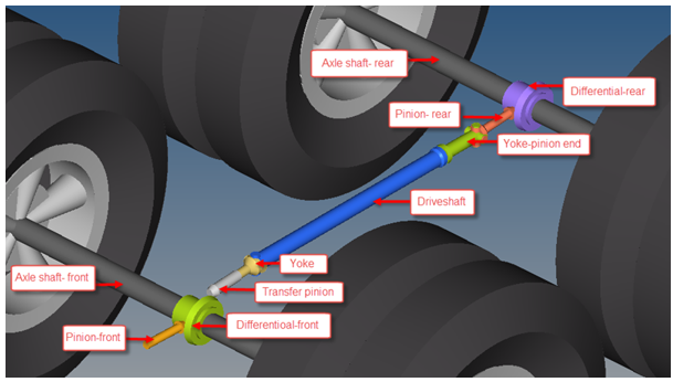 differential in the rear via a yoke-pinion end. The driveshaft connects via a yoke