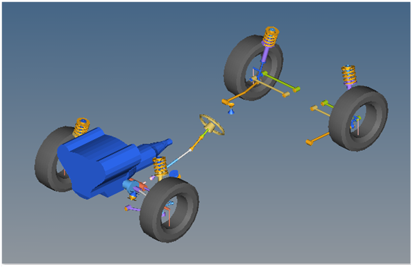 The front and rear wheel motions act on the wheel spindle revolute joints that connect the wheel hub to the knuckle. The motion is initially zero (fixing the wheels to the knuckle) so the model converges statically. The locking motions on the wheels are deactivated after convergence of the static analysis to allow the tires to rotate during the dynamic simulation.