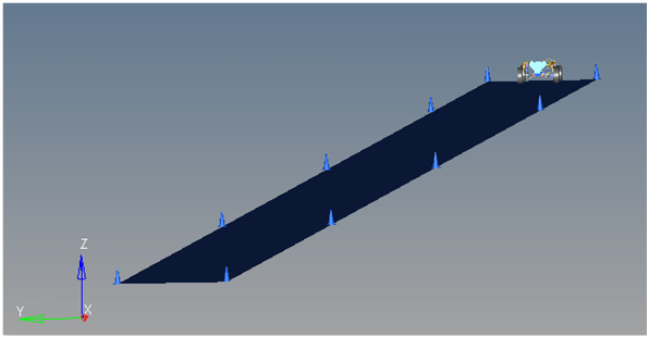 The road graphics are included to illustrate the path being driven and are defined parametrically using the data in the Straight line acceleration Form. All road graphics are used to illustrate the lane dimensions but they are not of the actual road used for calculating tire forces. Road graphics should never require editing unless the event is being fundamentally changed.