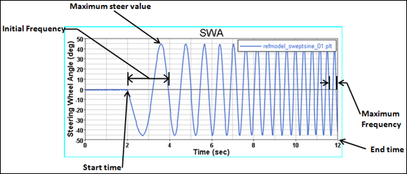 Note that the maximum frequency is a frequency limit only. The actual maximum frequency obtained in the simulation is a function of the Initial frequency, the frequency rate, and the start and end time. The steering wheel sine wave begins at the initial frequency at the start time and increases by the frequency rate each second until the event ends at the end time. The maximum frequency only comes in to effect if the end time is mismatched with the frequency rate.