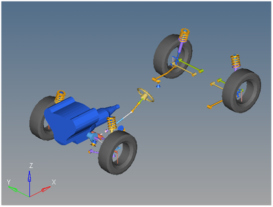 The Front and Rear Wheel Motions act on the wheel spindle revolute joints that connect the wheel hub to the knuckle. The motion is initially zero (fixing the wheels to the knuckle) so the model converges statically. The wheel locking motions are deactivated after the convergence of the static analysis to allow the tires to rotate during dynamic analysis.